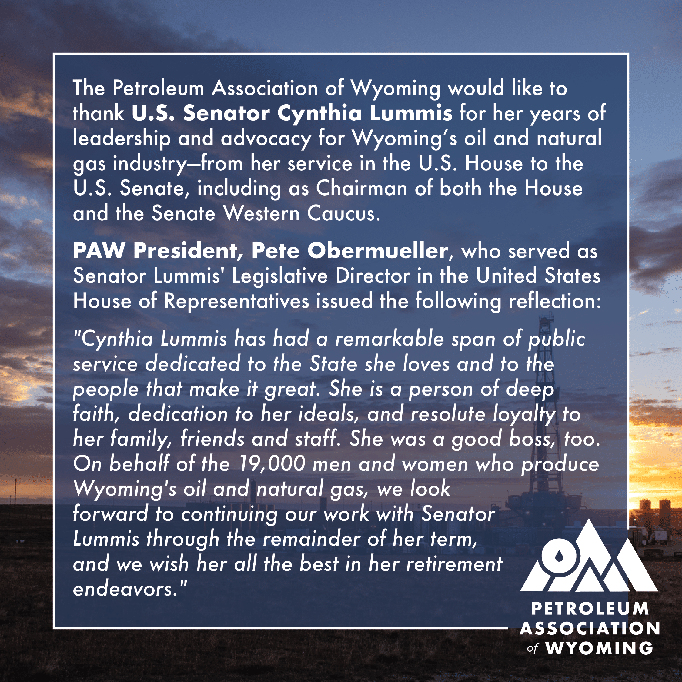 The Petroleum Association of Wyoming would like to thank U.S. Senator Cynthia Lummis for her years of leadership and advocacy for Wyoming’s oil and natural gas industry—from her service in the U.S. House to the U.S. Senate, including as Chairman of both the House and the Senate Western Caucus.